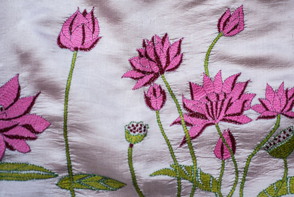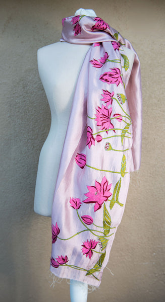 Lovely, dark pink lotus with green leaves and pods motifs on light-pink hand-woven silk. Scarf is embroidered by hand by Anjumanara and her collective of craftswomen in Shantiniketan, West Bengal India. Designed by Abhisek Roy for Shanteni, this limited edition piece takes 2 weeks to embroider.